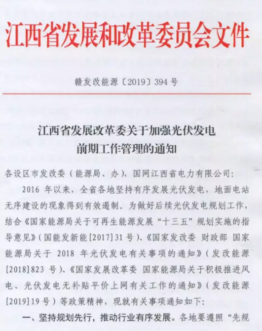 江西下發通知嚴控地面及分布式光伏全部納入規劃。