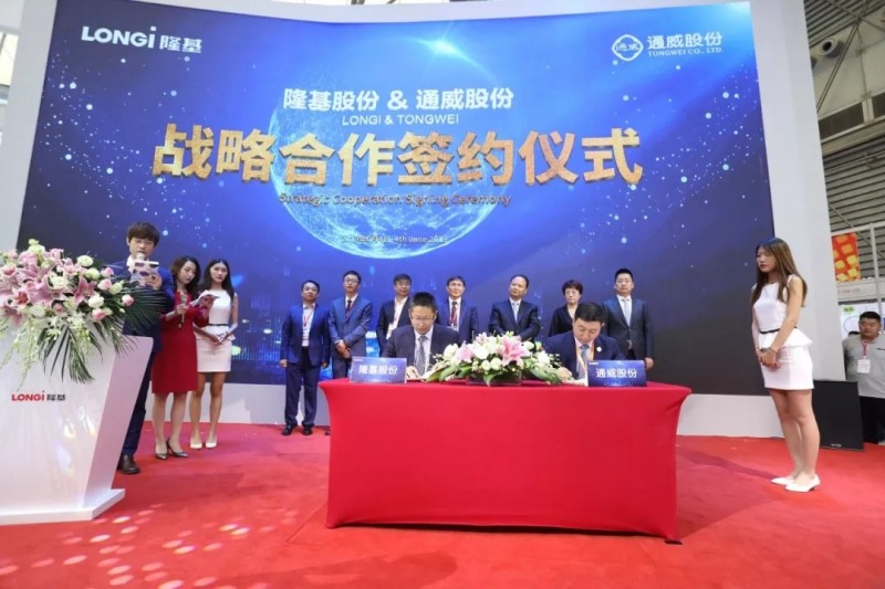 在隆基集團董事長鐘寶申和通威集團董事局主席劉漢元等領導的共同見證下,雙方代表周義成和謝毅在親切友好的氛圍里簽署了《隆基綠能科技股份有限公司與通威股份有限公司關于光伏產業戰略合作協議》(以下簡稱《協議》)。
