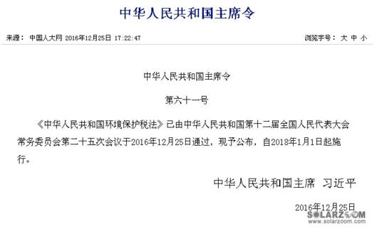 12月25日,習近平簽發中華人民共和國第六十一號主席令:《中華人民共和國環境保護稅法》已由中華人民共和國第十二屆全國人民代表大會常務委員會第二十五次會議于2016年12月25日通過,現予公布,自2018年1月1日起施行。