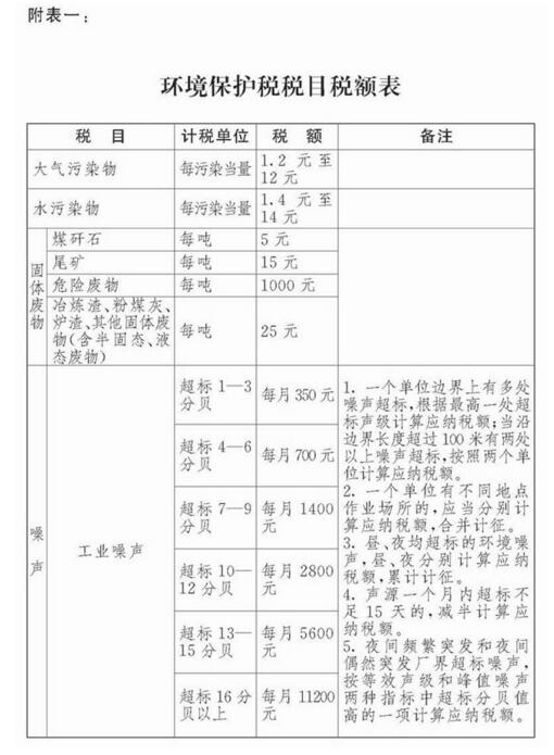 第六條 環境保護稅的稅目、稅額,依照本法所附《環境保護稅稅目稅額表》執行。