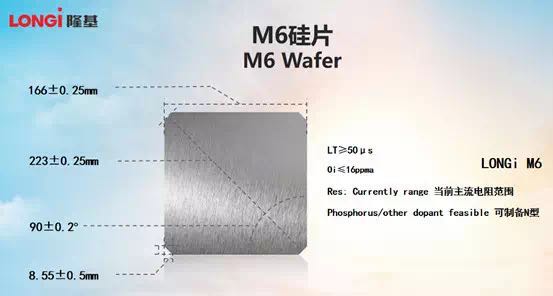 據隆基硅片事業(yè)部副總裁謝天介紹,M6硅片即166mm*166mm尺寸的大硅片,較M2(156.75mm)硅片面積提升了12.21%,對于電池、組件制造商而言,使用M6硅片能夠顯著提升組件輸出功率。