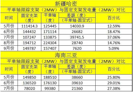 平單軸追蹤系統能有效提升發電量,通過理論測算及實測數據對比分析可知,對于提高項目收益率,縮短投資回報周期效果明顯。以下為新疆哈密和海南三亞某電站的實測數據,對比可見平單軸追蹤系統比固定支架發電量有非常明顯的提升。
