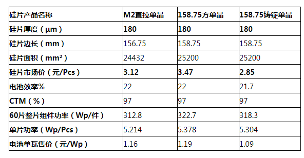 第二,據(jù)筆者了解,同種PERC電池工藝條件下,目前鑄錠單晶電池的平均效率與直拉單晶比,差距已在0.3%以內(nèi)。按單晶PERC電池效率22.0%、鑄錠單晶PERC電池效率21.7%、以及二者保持相同的CTM、取97%計算,60片156.75(M2)尺寸的直拉單晶PERC組件功率均值約為312.8瓦,60片158.75直拉單晶PERC組件功率約為322.7瓦,而158.75尺寸的鑄錠單晶PERC組件功率約為318.3瓦,如下表所示。