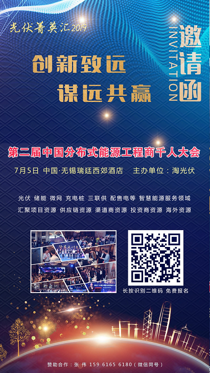 在此背景下,由淘光伏主辦的2019第二屆中國分布式光伏工程商千人大會暨淘能杯2018中國分布式光伏優秀品牌頒獎典禮將于2019年7月5日在江蘇省無錫市瑞廷西郊酒店(五星級)舉辦,屆時將有500+光伏及儲能等新能源行業一線工程商、經銷商、服務商、集成商、安裝商、開發商、投資商、EPC公司、設計院、設備商相聚無錫,主辦方將邀請新能源行業資深專家對2019光伏最新政策進行深度解讀,共同探討2019中國分布式光伏發展前景和應對措施,提振廣大光伏人信心,提前布局,順勢而為,相互交流,結識人脈,資源對接,為中國分布式光伏持續健康發展保駕護航!