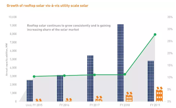 (屋頂與公用事業規模太陽能增長,來源:BridgetoIndia)