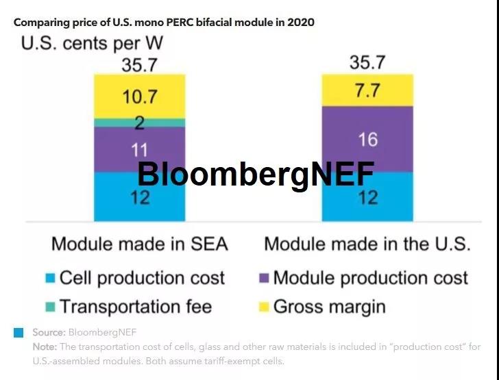 36美分/瓦的價(jià)格低于早先大多數(shù)對(duì)美國(guó)2020年組件價(jià)格的預(yù)期(40美分/瓦),但高于世界其它地區(qū)23美分/瓦的組件單價(jià)。之所以如此,是因?yàn)槊绹?guó)對(duì)從中國(guó)進(jìn)口的電池片和組件征收包括反傾銷稅與反補(bǔ)貼,201及301關(guān)稅,使原產(chǎn)于中國(guó)的電池片和組件無(wú)法供應(yīng)美國(guó)市場(chǎng)進(jìn)而導(dǎo)致價(jià)格扭曲。雙面組件的免稅優(yōu)勢(shì)將一直保持到2022年2月,即201關(guān)稅條款終止之時(shí)。