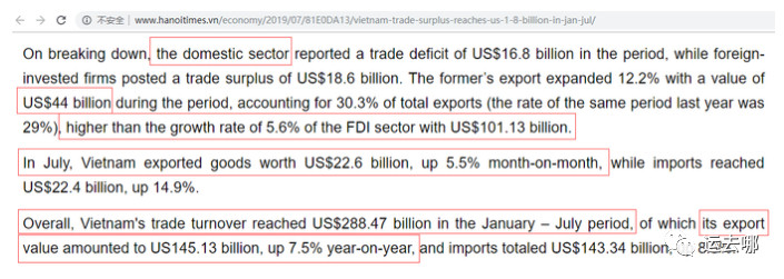1-7月,美國(guó)為越南最大出口市場(chǎng),共計(jì)出口325億美元,同比暴漲25.4%;越南對(duì)歐盟出口243.2億美元,同比增0.4%;越南對(duì)華出口200億美元,同比增0.1%。