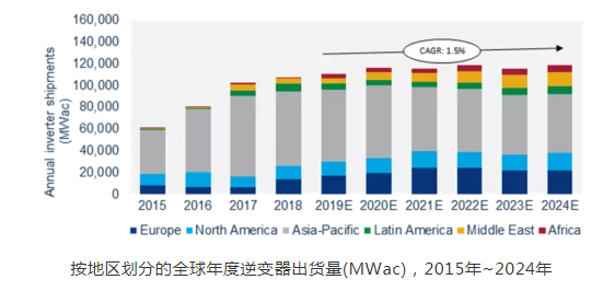 預計隨著市場的變化,從2019年到2024年,集中式逆變器和三相逆變器的任何產品類型收入都將下降最多。而微型逆變器,單相組串式逆變器,直流優化器和混合存儲的逆變器在出貨量方面雖然是小份額市場,但市場會有所增長。