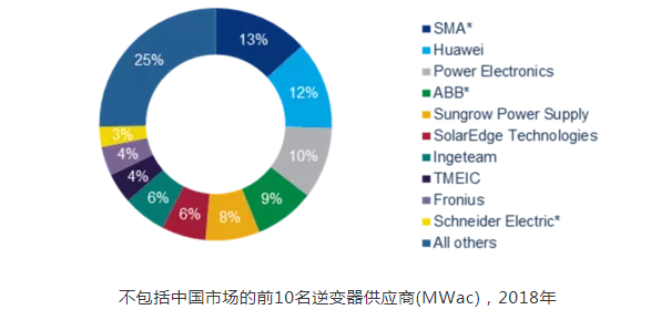 2018年,中國逆變器制造商占全球出貨量的28%,高于2017年出貨量的22%和2016年的14%,在歐洲、拉丁美洲、中東等地區,中國公司的市場份額也比去年有所增長。作為全球頂級逆變器制造商,華為在拉丁美洲、歐洲等地區的擴張非常成功。