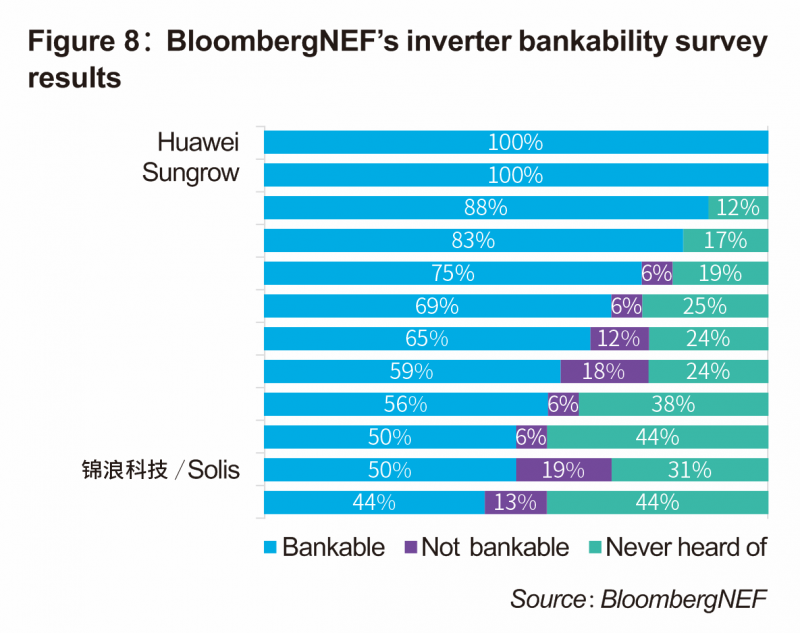 此次BNEF發(fā)布的評選報告主要針對全球知名光伏逆變器制造商的融資價值展開。他們面向全球金融機構(gòu)(銀行、基金)、項目開發(fā)商(EPC)、獨立電力生產(chǎn)運營商等光伏行業(yè)利益相關方發(fā)出問卷調(diào)查表,并與質(zhì)量檢測和技術(shù)專家進行深度訪談,調(diào)研范圍覆蓋全球25吉瓦的光伏產(chǎn)品。