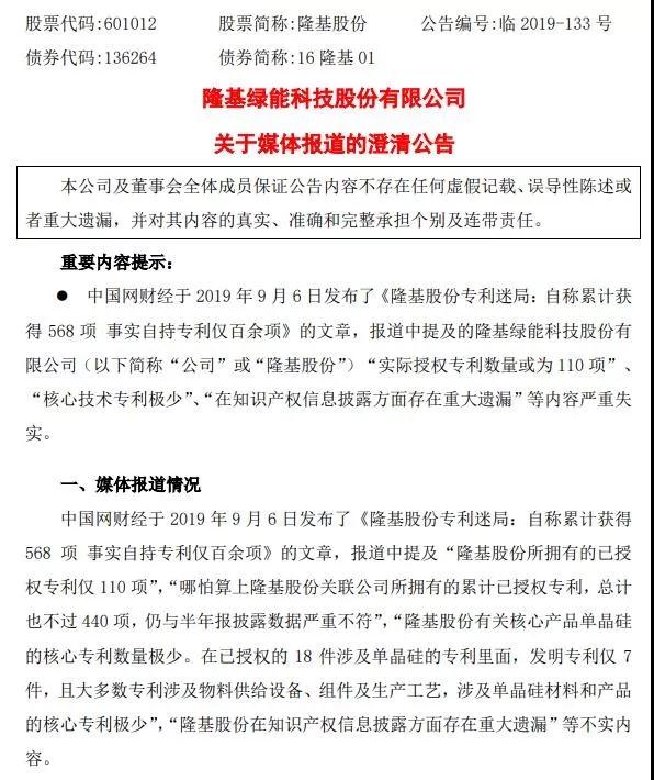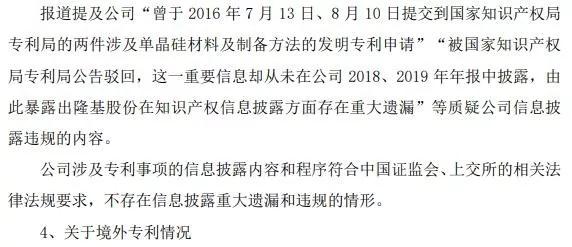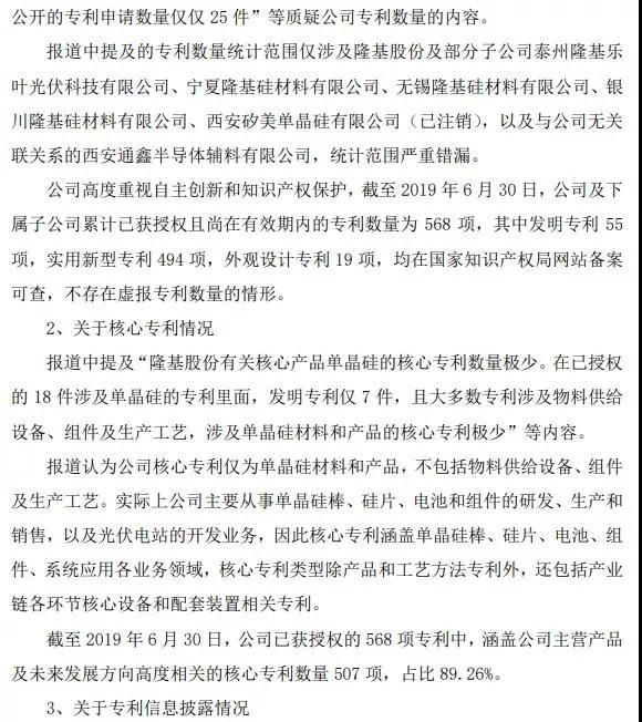 隆基股份指出,公司高度重視自主創新和知識產權保護。截至6月30日,公司及下屬子公司累計已獲授權且尚在有效期內的專利數量為568項,其中發明專利55項,實用新型專利494項,外觀設計專利19項,均在國家知識產權局網站備案可查,不存在虛報專利數量的情形。