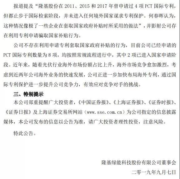 針對該報道影射公司存在利用專利申請騙取國家補貼行為,隆基股份表示,公司不存在利用申請專利套取國家政府補貼的行為。目前,公司已經申請的PCT國際專利數量為8項,均按照常規流程進行中,其中2項已進入國家申請階段。