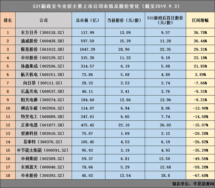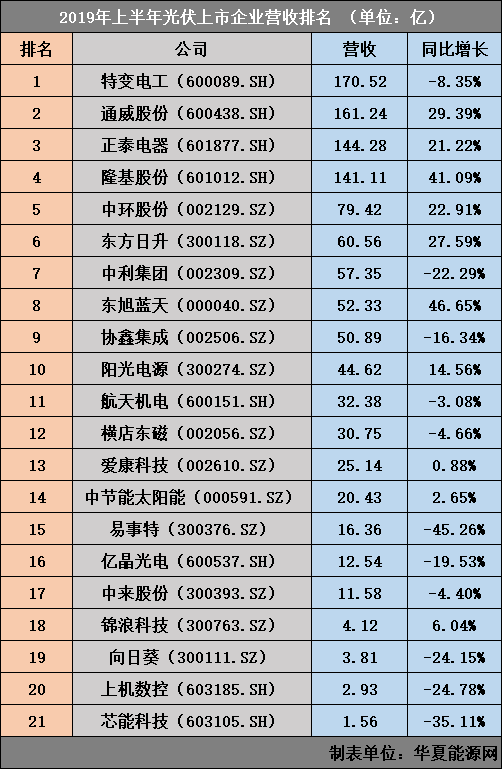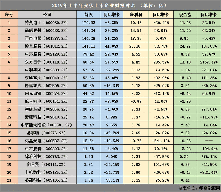 除此之外,中環股份、東方日升、東旭藍天和陽光電源均在營收增長中表現不俗;21家主要光伏上市企業中,有10家實現了半年營收正增長;531新政后,激流勇進、實現上市的芯能科技和上機數控,半年營收表現不佳。
