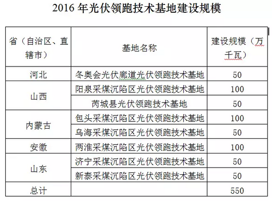 2016年國家能源局下達(dá)光伏領(lǐng)跑技術(shù)基地規(guī)模550萬千瓦,同時明確光伏領(lǐng)跑技術(shù)基地應(yīng)采取招標(biāo)、優(yōu)選等競爭性比選方式配置項目,而且應(yīng)將電價作為主要競爭條件。基地內(nèi)單個光伏電站項目的建設(shè)規(guī)模原則上應(yīng)在10萬千瓦以上。