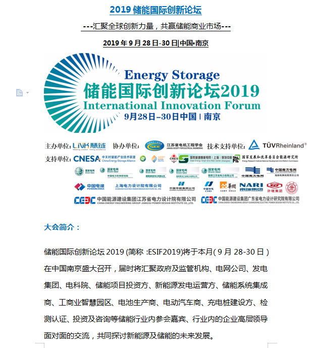 【南京儲能峰會開幕倒計時】 2019儲能國際創新論壇誠邀您出席