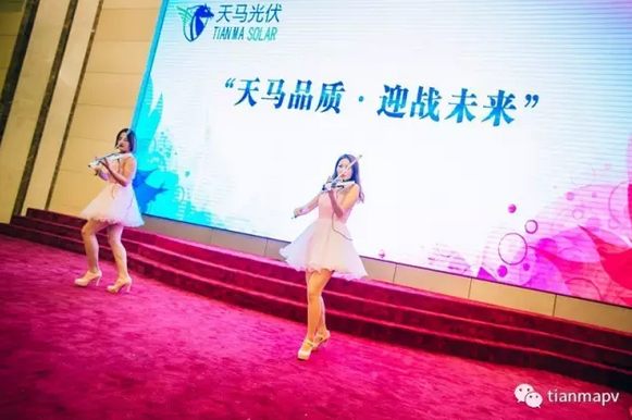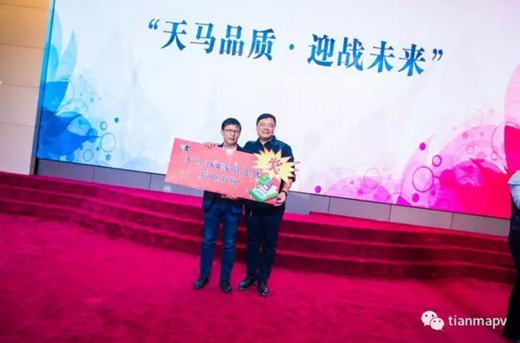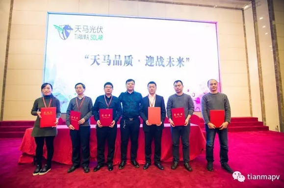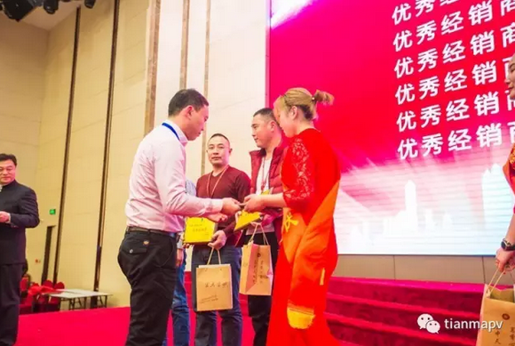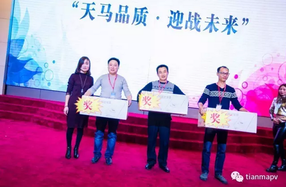 隨后,在頒獎典禮上,分別頒發了“優秀經銷商”及“戰略合作伙伴”獎項。天馬光伏戰略合作伙伴代表——北京首信陽光新能源科技服務有限公司的劉道偉先生、山東永遠集團有限公司的王忠民先生,天馬光伏優秀經銷商代表——揚州夢海光電科技工程有限公司的王靜先生分別發表了講話,這無疑為天馬光伏未來發展打了一支強心劑,現場雷鳴般掌聲接連不斷。