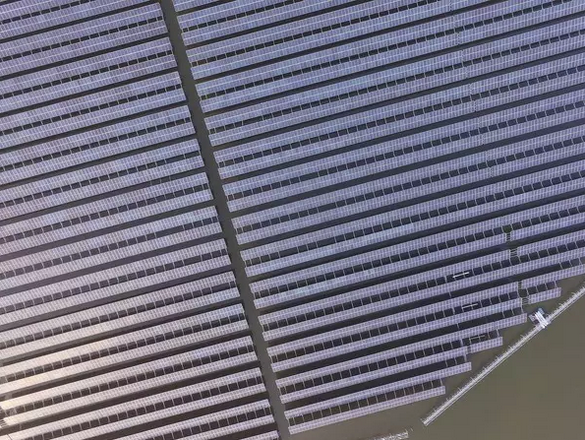 空中鳥(niǎo)瞰水庫(kù)上鋪設(shè)的光伏陣列。