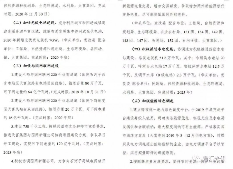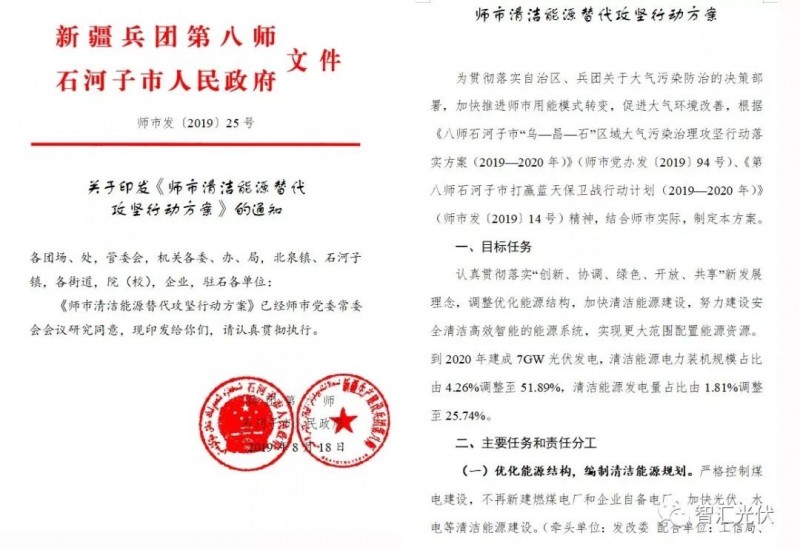 2019年8月,新疆石河子市出臺清潔能源替代攻堅行動方案。提出到2020年底建成7GW光伏發電,清潔能源電力裝機規模占比由4.26%調整至51.89%,清潔能源發電量占比由1.81%調整至25.74%;并明確了送出方案。