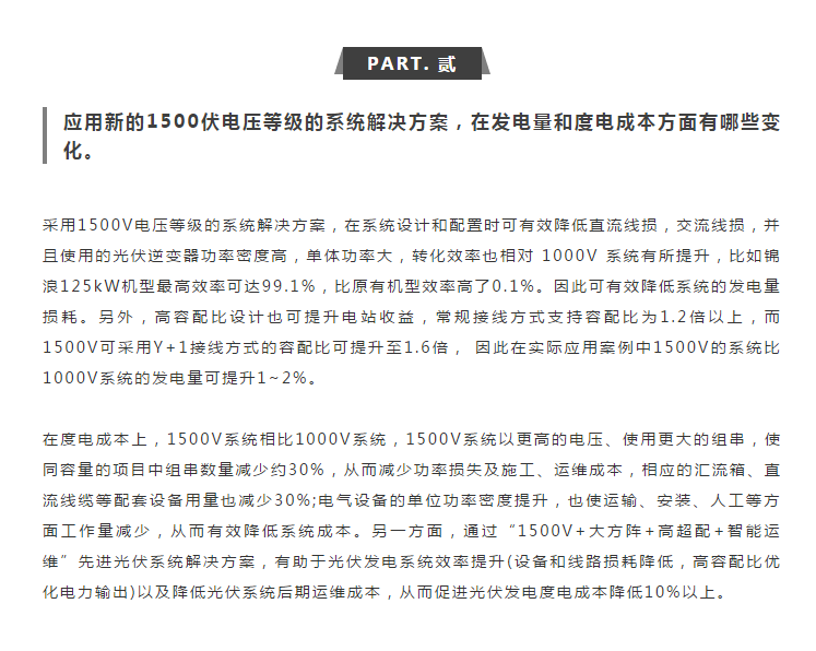 核心提示:“1500V電壓系統+大功率+高超配”先進光伏系統解決方案,度電成本降低10%以上