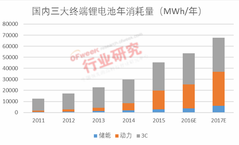 2013年以前3C鋰電應(yīng)用占據(jù)鋰電池市場(chǎng)近90%的市場(chǎng)份額,隨著新能源汽車的高速發(fā)展,這一格局很快被打破,2013年至2016年期間動(dòng)力電池的銷量以近80%的速度增長(zhǎng),同期鋰電儲(chǔ)能產(chǎn)業(yè)也在市場(chǎng)和政策的推動(dòng)慢慢成長(zhǎng)。OFweek行業(yè)研究中心數(shù)據(jù)顯示,2016年動(dòng)力電池應(yīng)用量大約21.7Gwh,占鋰電池應(yīng)用總量已超40%,儲(chǔ)能電池應(yīng)用量大約3.8Gwh,增速約為30%。