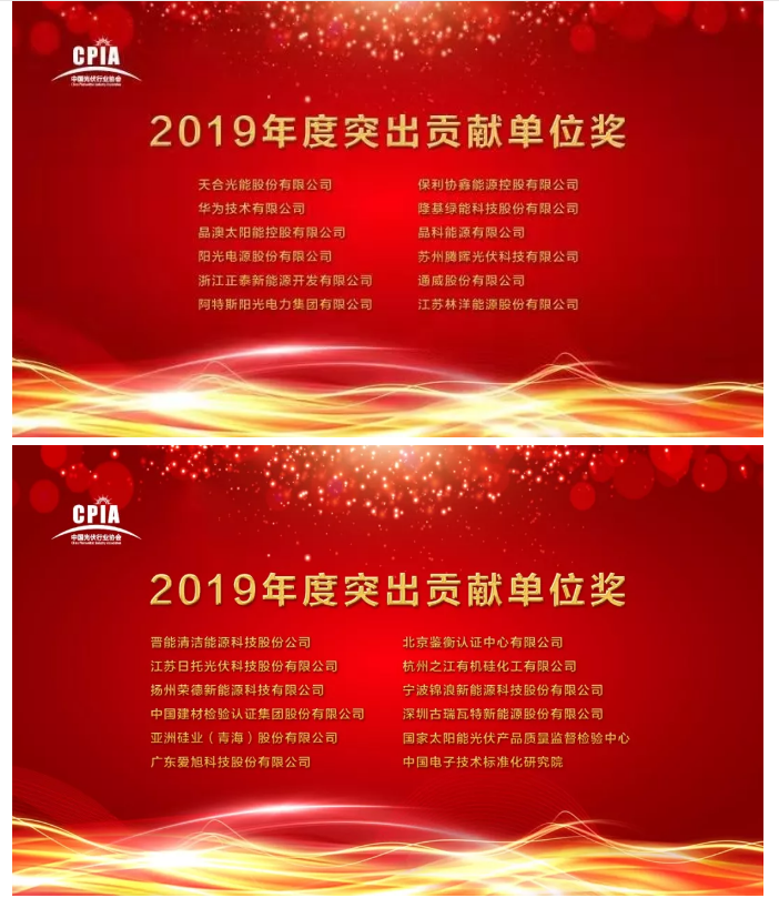 為感謝2019年度,在協(xié)會各項會議活動、標(biāo)準(zhǔn)及戶用工作等方面,為協(xié)會做出了突出貢獻(xiàn)的會員單位,“2019中國光伏行業(yè)年度大會暨創(chuàng)新發(fā)展高峰論壇”期間,中國光伏行業(yè)協(xié)會特授予天合光能股份有限公司、華為技術(shù)有限公司、晶澳太陽能控股有限公司、陽光電源股份有限公司、浙江正泰新能源開發(fā)有限公司、阿特斯陽光電力集團(tuán)有限公司、保利協(xié)鑫能源控股有限公司、隆基綠能科技股份有限公司、晶科能源有限公司、蘇州騰暉光伏科技有限公司、通威股份有限公司、江蘇林洋能源股份有限公司、晉能清潔能源科技股份公司、江蘇日托光伏科技股份有限公司、揚州榮德新能源科技有限公司、中國建材檢驗認(rèn)證集團(tuán)股份有限公司、亞洲硅業(yè)(青海)股份有限公司、廣東愛旭科技股份有限公司、北京鑒衡認(rèn)證中心有限公司、杭州之江有機硅化工有限公司、寧波錦浪新能源科技股份有限公司、深圳古瑞瓦特新能源股份有限公司、國家太陽能光伏產(chǎn)品質(zhì)量監(jiān)督檢驗中心、中國電子技術(shù)標(biāo)準(zhǔn)化研究院等24家單位“2019年度突出貢獻(xiàn)單位獎”。