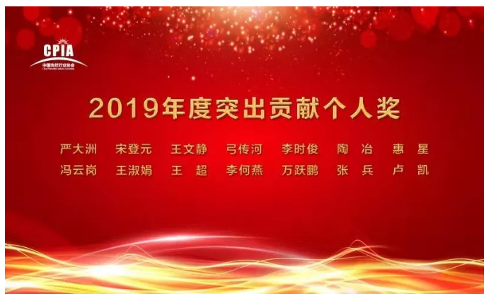 同時,為感謝2019年度,在協(xié)會各項會議活動、標(biāo)準(zhǔn)工作、戶用工作以及路線圖等方面,為協(xié)會做出了突出貢獻(xiàn)的個人,特授予中國恩菲工程技術(shù)有限公司副總工程師(多晶硅材料制備技術(shù)國家工程實驗室主任)嚴(yán)大洲、英利綠色能源控股有限公司首席技術(shù)官宋登元、中科院電工所研究部主任王文靜、晶科電力科技股份有限公司設(shè)計院院長弓傳河、深圳市捷佳偉創(chuàng)新能源裝備股份有限公司總經(jīng)理李時俊、國家發(fā)改委能源研究所可再生能源發(fā)展中心副主任陶冶、西北勘測設(shè)計研究院有限公司新能源工程院資源與總圖設(shè)計所所長惠星、上海電力設(shè)計院新能源部副總經(jīng)理馮云崗、智匯光伏創(chuàng)始人王淑娟、光伏們主編王超、索比光伏網(wǎng)總經(jīng)理李何燕、保利協(xié)鑫能源控股有限公司副總裁萬躍鵬、天合光能股份有限公司副總裁(中國光伏行業(yè)協(xié)會戶用專委會聯(lián)席主任委員)張兵、浙江正泰安能電力系統(tǒng)工程有限公司總經(jīng)理盧凱等14人 “2019年度突出貢獻(xiàn)個人獎” 。