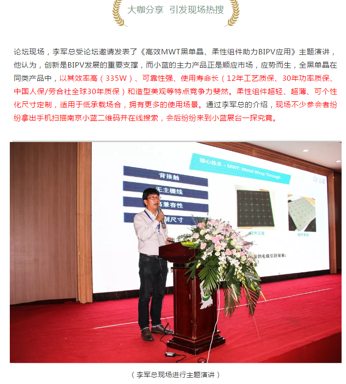 南京小藍(lán)重磅推出全黑單晶、柔性組件,MWT助力BIPV創(chuàng)新發(fā)展論壇