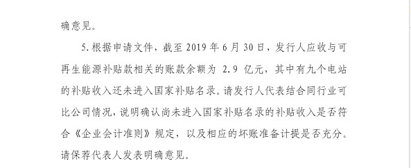 審核意見的第三條提出:截至 2019 年 6 月 30 日,發行人應收與可再生能源補貼款相關的賬款余額為 2.9 億元,其中有九個電站的補貼收入還未進入國家補貼名錄。請發行人補充披露尚未進入國家補貼名錄的 補貼收入的詳細情況,并明確說明該項收入的確認是否符合《企業會計準則》的規定,相應的壞賬準備計提是否充分。