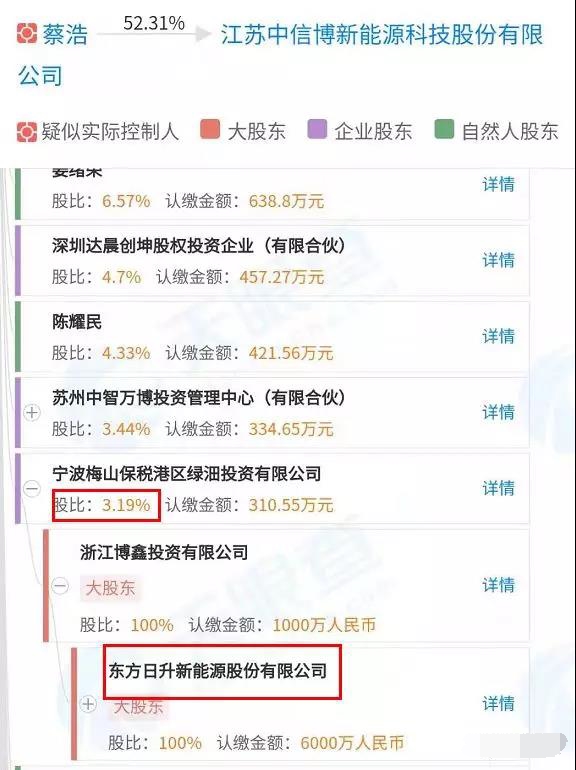天眼查信息顯示,2017年4月,上市公司東方日升通過全資子公司博鑫投資的子公司綠沺投資參與中信博增資,截至2020年1月,綠沺投資為中信博第七大股東,持股數(shù)310.55萬股,持股比例3.19%。