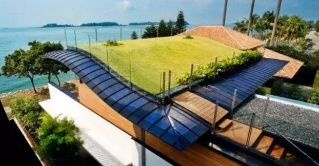 光伏板與屋頂設計相融合,光伏發電供給整個別墅的電力系統,整個設計既美觀又環保,創意十足!