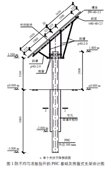 2) 采用可調(diào)節(jié)高度的太陽能板支架,即支架設(shè)計為與樁抱箍固定的形式。在個別樁發(fā)生凍脹時,可通過調(diào)節(jié)抱箍式支架的高度來調(diào)平支架及組件,避免支架和組件的變形破壞。