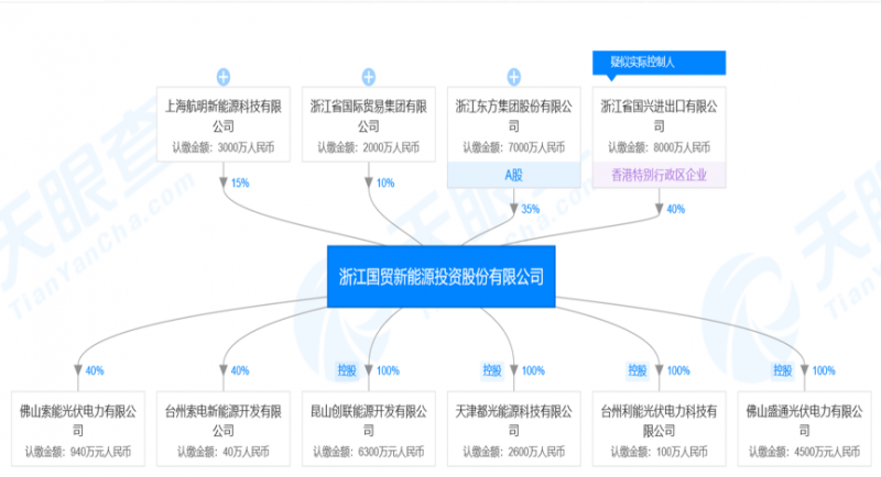 天眼查股權穿透圖顯示,浙江國貿新能源股權分屬4家公司,其中浙江東方集團控股35%,浙江省國興進出口有限公司持股40%,疑似實際控制人。