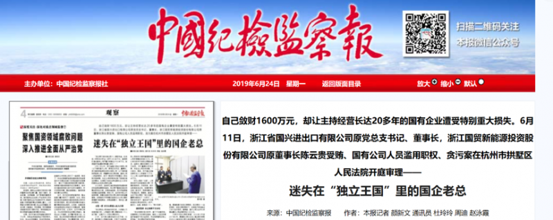 根據中國紀委監察報2019年6月24日的報道,浙江國興進出口公司原黨總支書記、董事長,浙江國貿新能源投資股份有限公司原董事長陳云貴收受他人財物共計折合人民幣1600余萬元,濫用職權造成國有公司嚴重虧損高達6780余萬元。