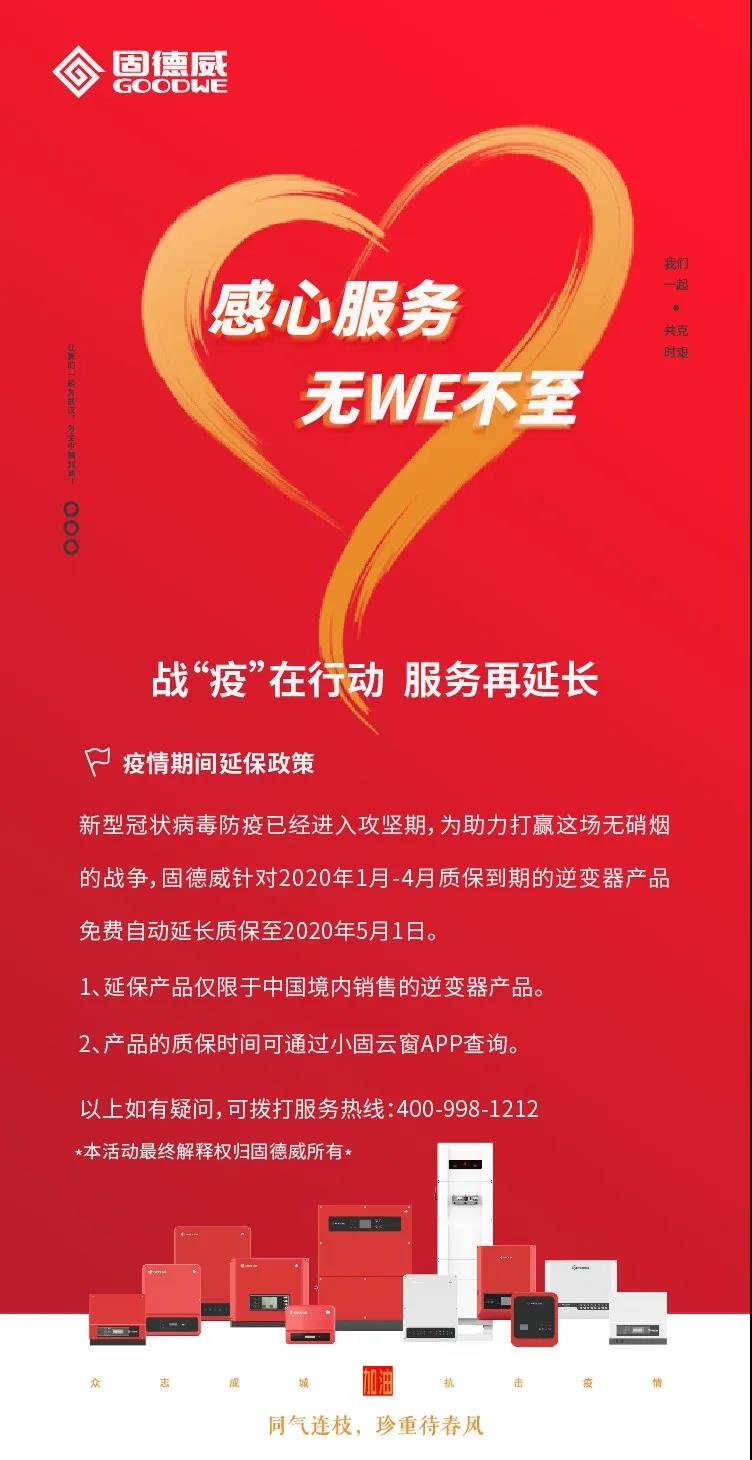 新型冠狀病毒防疫已經進入攻堅期,為助力打贏這場無硝煙的戰爭,固德威針對2020年1月-4月質保到期的