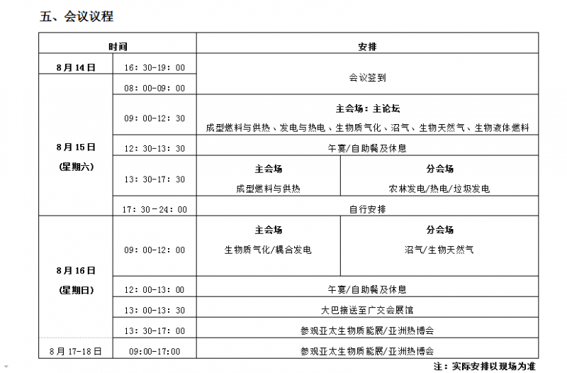 本次高峰論壇設立“主論壇”, “生物質成型燃料與供熱論壇”,“農林/固廢垃圾發電與熱電論壇”“生物質氣化與耦合發電論壇”,“沼氣、生物天然氣論壇”五大主題,同時將安排茶話會環節,互換名片交流環節,大咖對話、嘉賓答疑環節,全體人員合影留念環節,并設置商務洽談區、品牌展示區、茶歇洽談區、媒體采訪區,方便您與貴賓洽談!8月16日下午會議結束后將安排大巴接送至廣交會展館參觀APBE第9屆亞太國際生物質能展,在此,誠邀您撥冗與會!