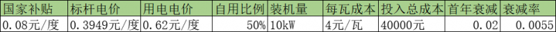 根據今年的補貼狀況、電價情況、系統成本設置一下場景:10kW的戶用光伏裝機,每瓦成本4元,投入總成本4萬元,采用自發自用、余電上網的模式下,假設自用比例為50%。