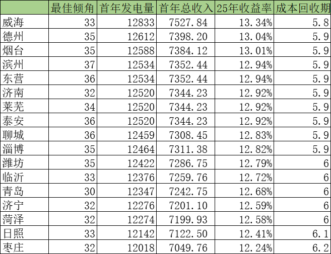 根據計算,我們得出了山東省各地市最佳傾角、首年發電量、首年總收入、25年收益率、成本回收期等,并做了排名,大家可以參考。