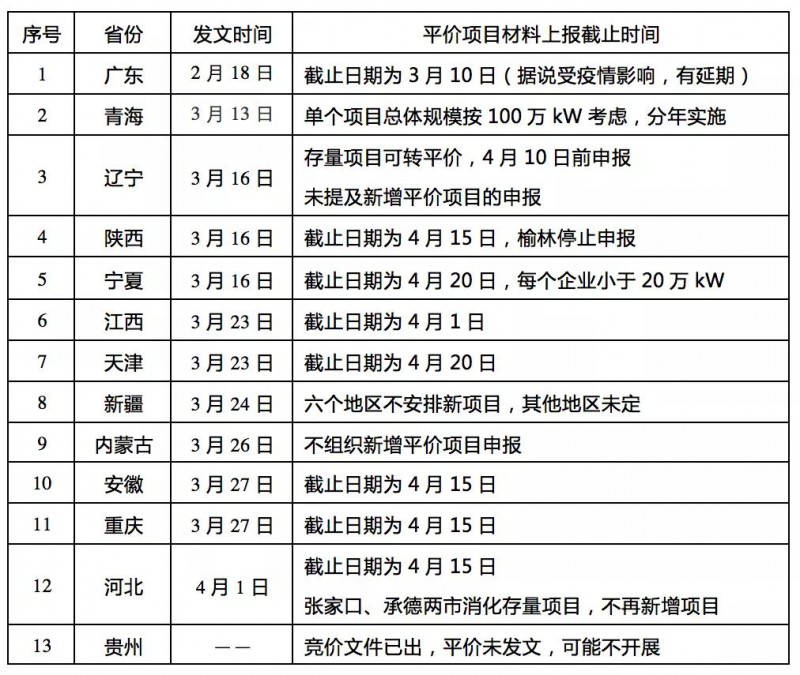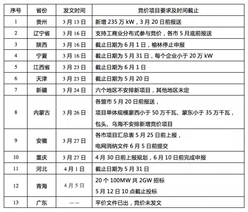 國(guó)家能源局要求在6月15日之前完成競(jìng)價(jià)上網(wǎng)項(xiàng)目的申報(bào)。由于省內(nèi)要提前開(kāi)展項(xiàng)目審核工作,所以一般要求企業(yè)在5月底將項(xiàng)目相關(guān)材料(備案文件、土地文件、接網(wǎng)意見(jiàn)函)上報(bào);有的省份直接要求提供電網(wǎng)批復(fù);有的省份,還要提前開(kāi)展省內(nèi)競(jìng)價(jià)(如青海)。這些都需要提前開(kāi)展工作。