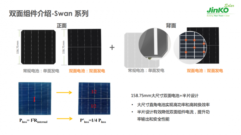 在4月2日舉行的2020首場雙面技術與應用在線研討會上,晶科能源產品經理劉曉穎表示,Swan雙面透明背板組件具有輕量化、高效率等優勢。由于采用了158.75mm大尺寸雙面電池和半片技術,在提升組件轉換效率的同時,可以降低組件內部電流,使組件的輸出功率和安全性大幅提升。