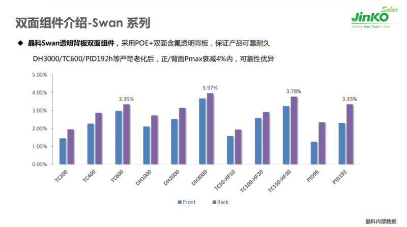 多重優勢讓大家對晶科的雙面組件充滿信心,但他們為何選擇透明背板技術路線?產品可靠性能否保證?劉曉穎指出,減重只是Swan系列組件核心優勢的一個方面,該產品采用POE+雙面含氟透明背板,保證其耐濕熱、耐磨損的特性,“經過DH3000/TC600/PID192h等嚴苛老化試驗后,組件正/背面峰值功率衰減都在4%以內,可靠性得到了充分驗證。”