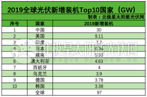 光伏新增裝機(jī)97GW,其中前十國(guó)家占比81%,詳細(xì)排名如下: