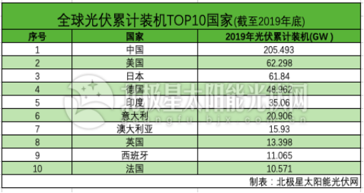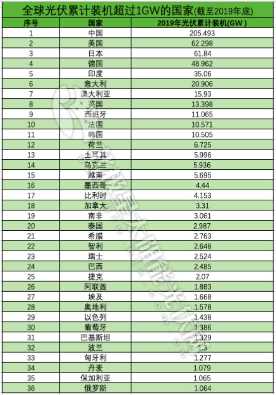2019累計(jì)裝機(jī)超過(guò)1GW的國(guó)家達(dá)36個(gè):