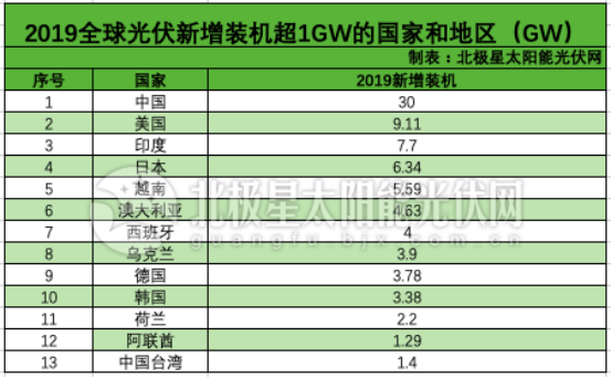2019年新增裝機(jī)超過(guò)1GW的國(guó)家和地區(qū)達(dá)13個(gè):
