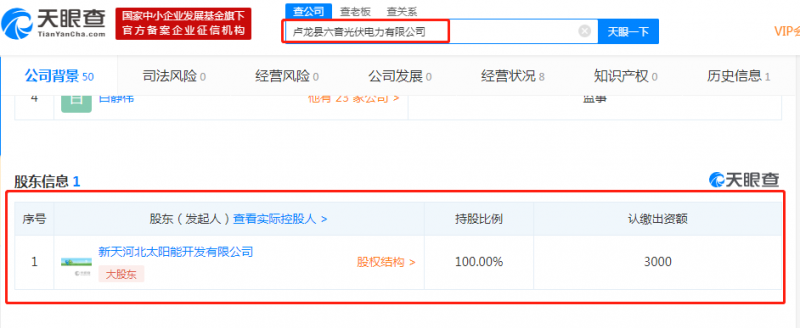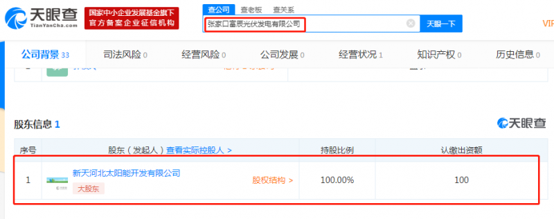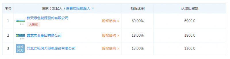 從天眼查獲悉,2014年4月24日,新天綠能聯合晶龍實業集團有限公司、河北紅松風力發電股份有限公司兩家企業共同設立新天河北太陽能開發有限公司,該公司主營業務為對太陽能等新能源項目的投資和太陽能設備銷售。其中,新天綠能持股比例69%,為第一大股東;晶龍實業集團持股比例18%,為第二大股東;河北紅松風力發電股份有限公司持股比例13%,為第三大股東。