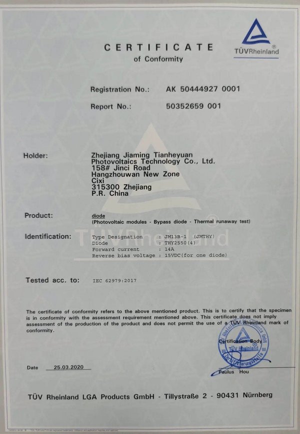 佳明天和緣副總經(jīng)理王福安表示:“公司致力于太陽能組件用接線盒、連接器及線纜的研發(fā)和制造,為客戶提供優(yōu)質(zhì)的產(chǎn)品和服務。此次通過TUV萊茵的二極管熱逃逸認證測試,證明了該款產(chǎn)品的質(zhì)量穩(wěn)定可靠。未來,希望我們雙方繼續(xù)加強合作,共同推進太陽能光伏行業(yè)的健康穩(wěn)定發(fā)展。”