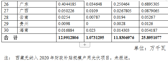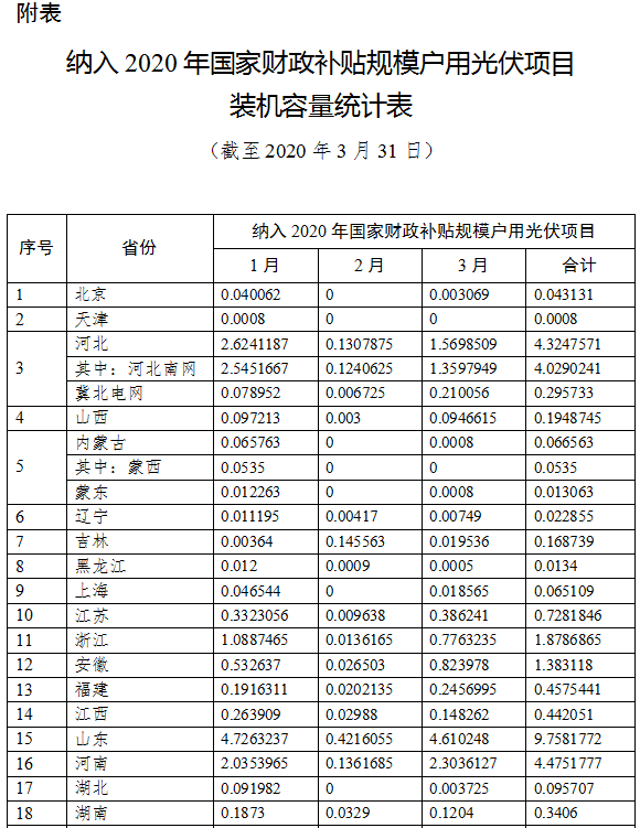 附表:納入2020年國家財(cái)政補(bǔ)貼規(guī)模戶用光伏項(xiàng)目裝機(jī)容量統(tǒng)計(jì)表(截至2020年3月31日)
