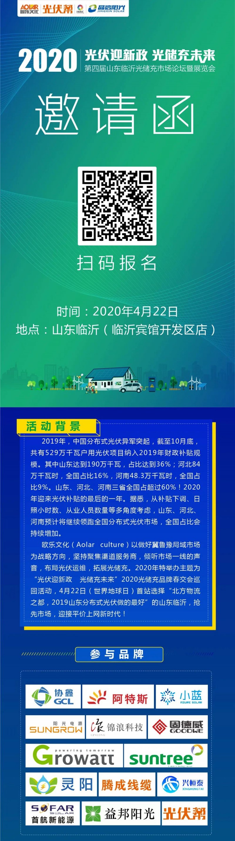 主題為“光伏迎新政 光儲充未來”,2020第四屆山東臨沂光儲充市場論壇暨展覽會4月22日(世界地球日)在“北方物流之都,2019山東分布式光伏做的最好”的山東臨沂召開,搶先市場,迎接平價上網新時代!