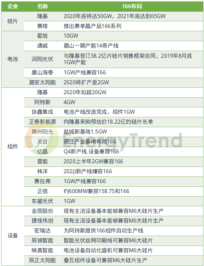 2019年7月,愛旭第一批166mm大尺寸電池正式下線,計劃到2020年底,公司將擁有10GW的166高效電池產能。愛旭認為,到2020年M6的出貨量將占其產量的60%以上,到2021年將增至90%。