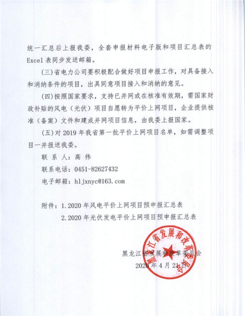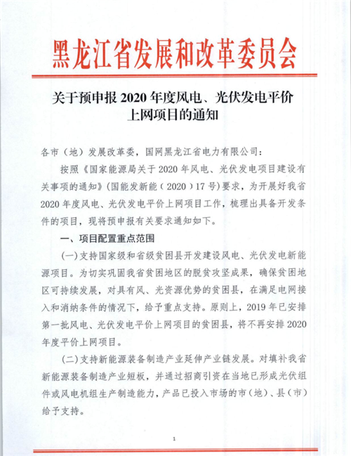 4月21日,黑龍江發(fā)改委印發(fā)《關(guān)于預(yù)申報2020年度風(fēng)電、光伏發(fā)電平價上網(wǎng)項目的通知》,就2020年風(fēng)、光平價項目申報的有關(guān)注意事項指出相關(guān)要求。
