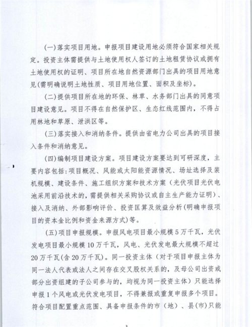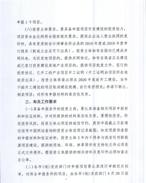 通知要求,風(fēng)電項目最低申報規(guī)模不得低于50MW,光伏不得低于100MW,最大規(guī)模不得超過200MW。同一投資主體只能申報1個風(fēng)電場或光伏項目,投資主體須在2020年底前開工,支持存量項目轉(zhuǎn)平價,報送截止日期為4月30日。